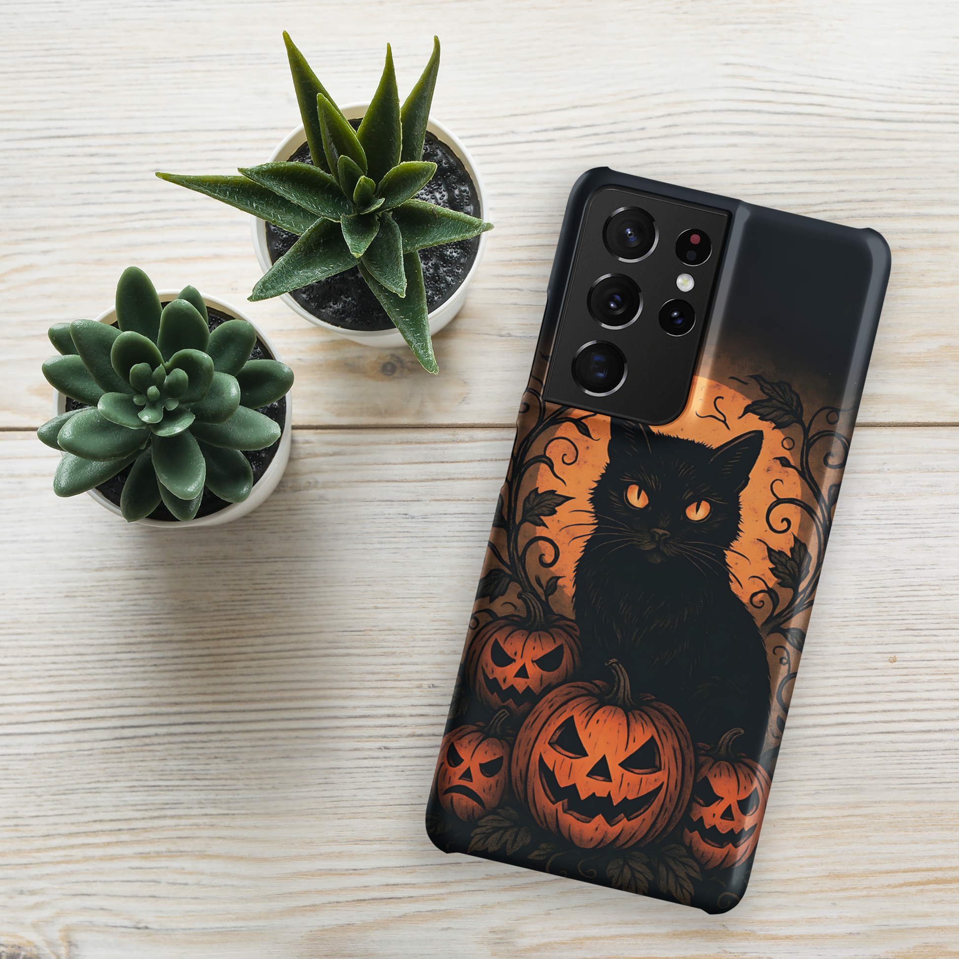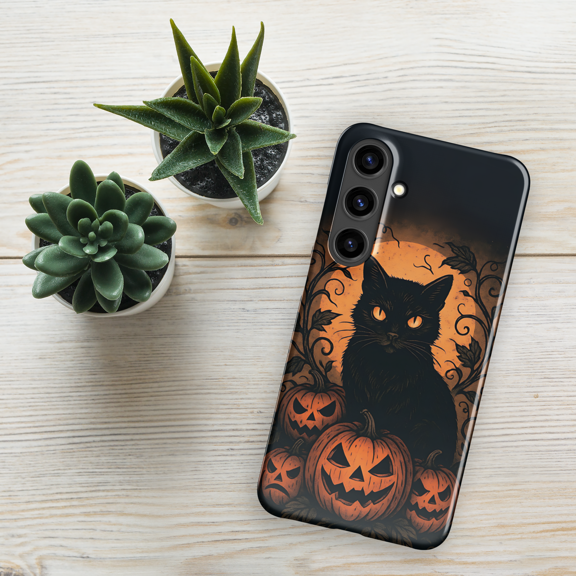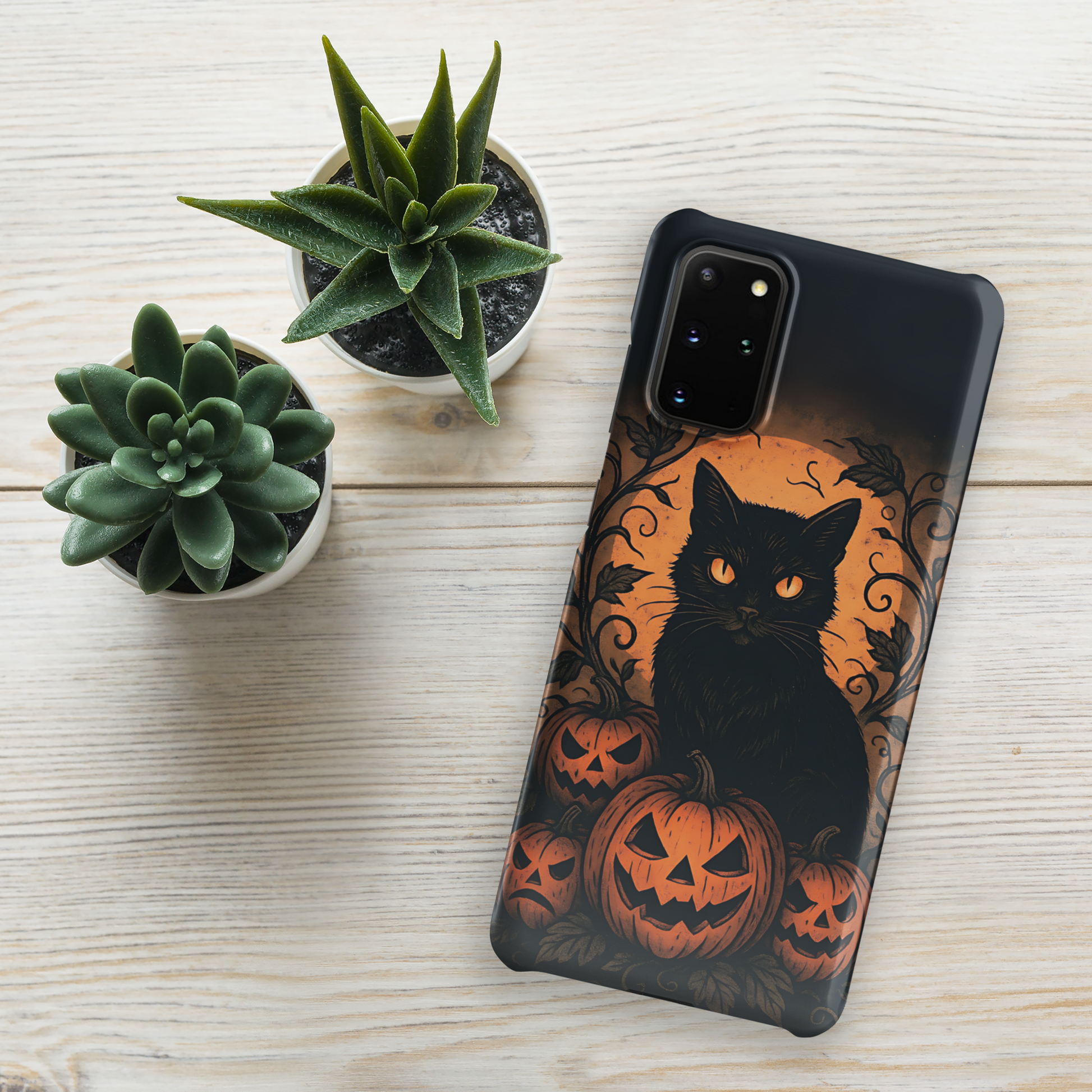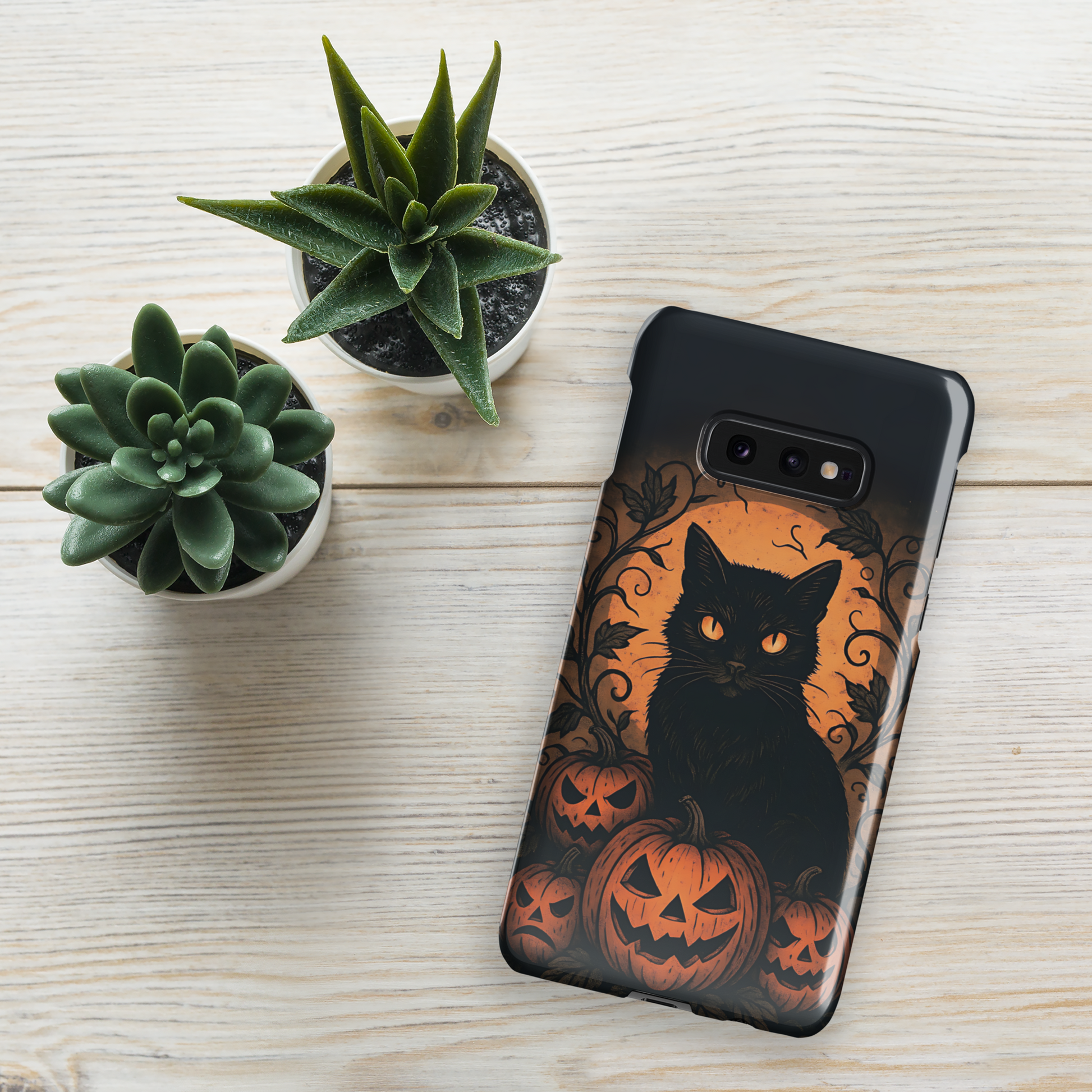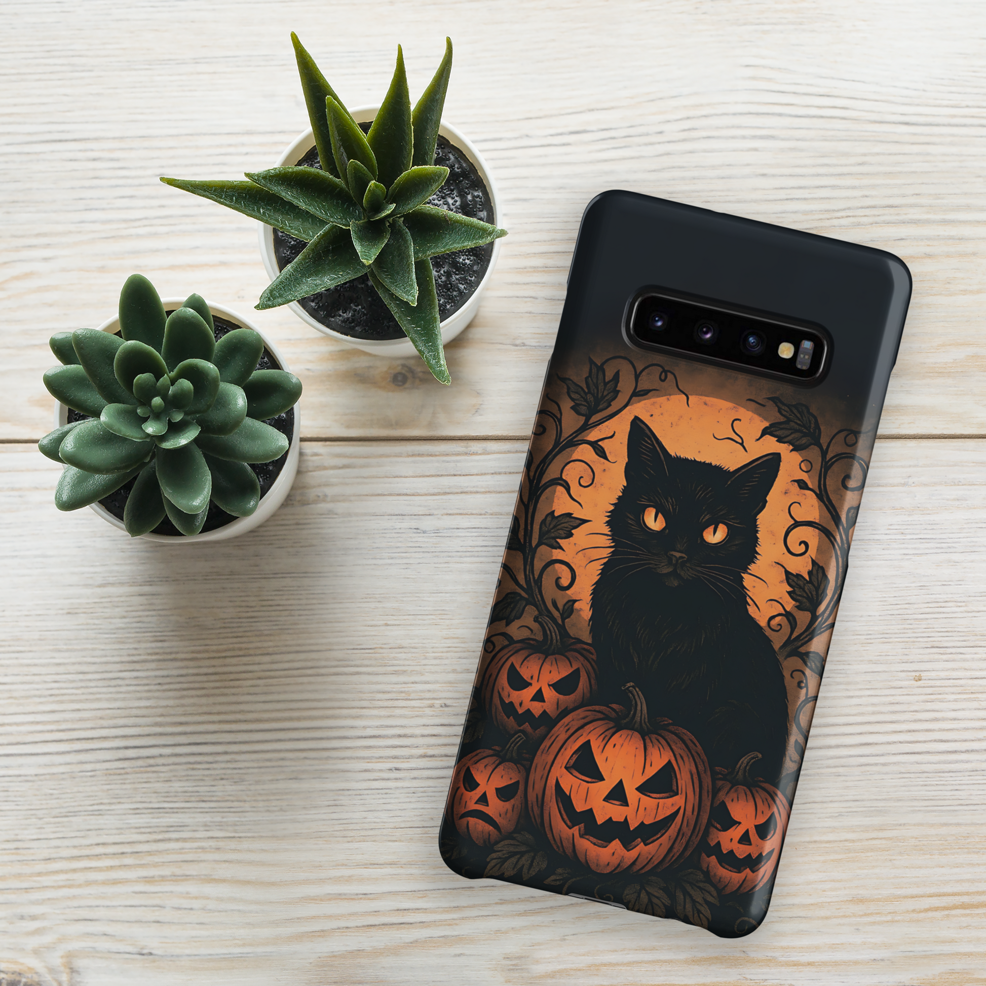 Halloween Harvest Cat Samsung Snap Case – Black Cat & Pumpkin Design (Galaxy S10–S25, Plus & Ultra)