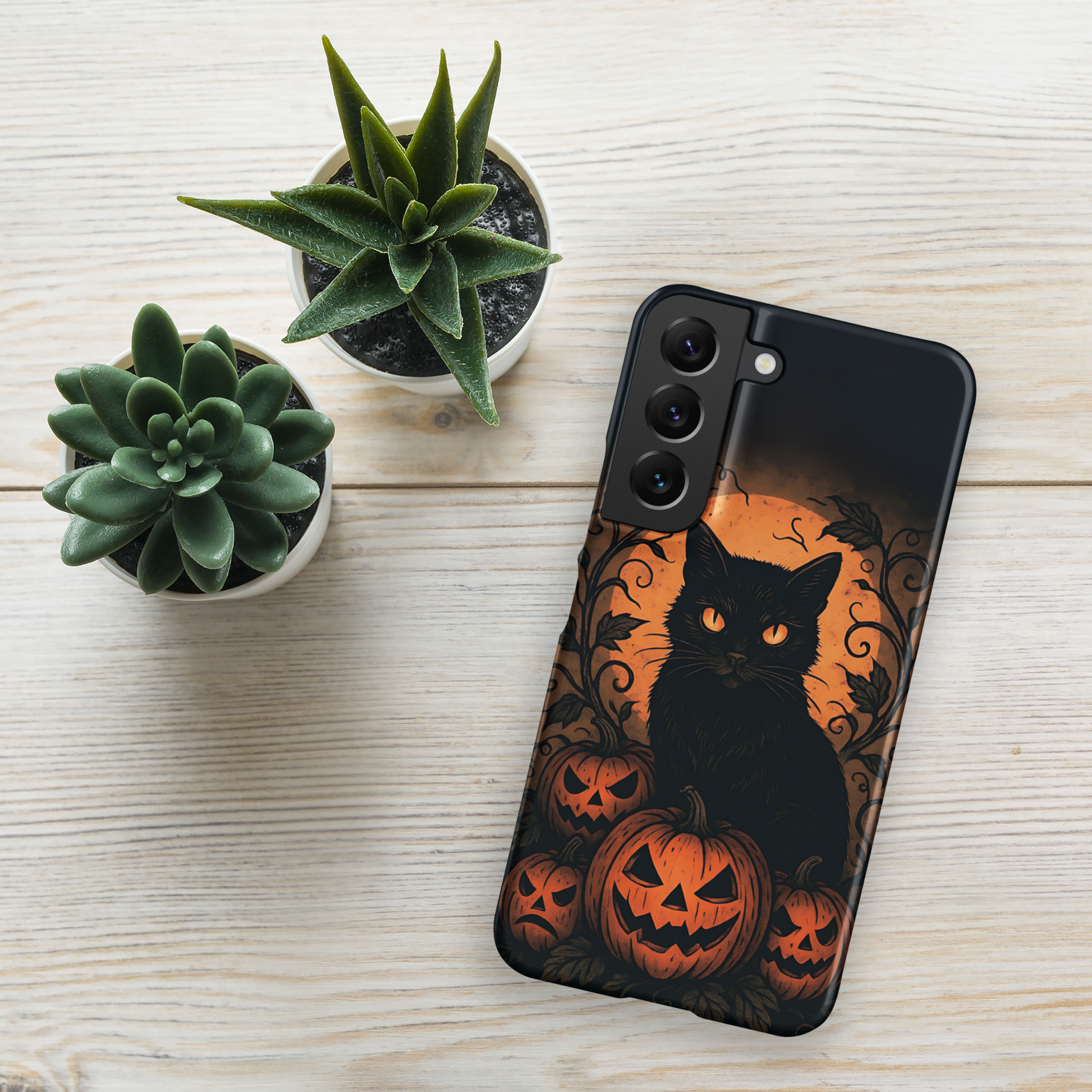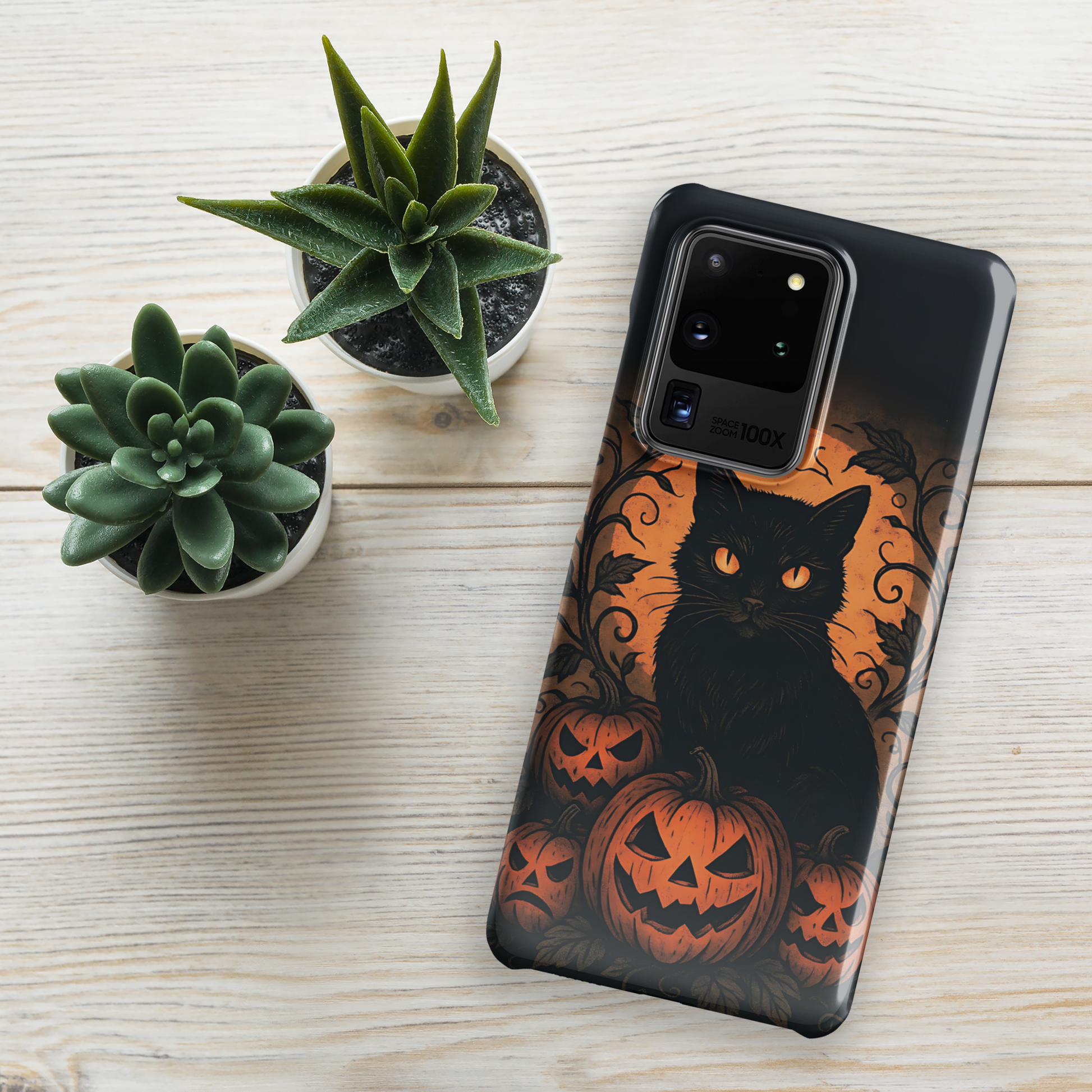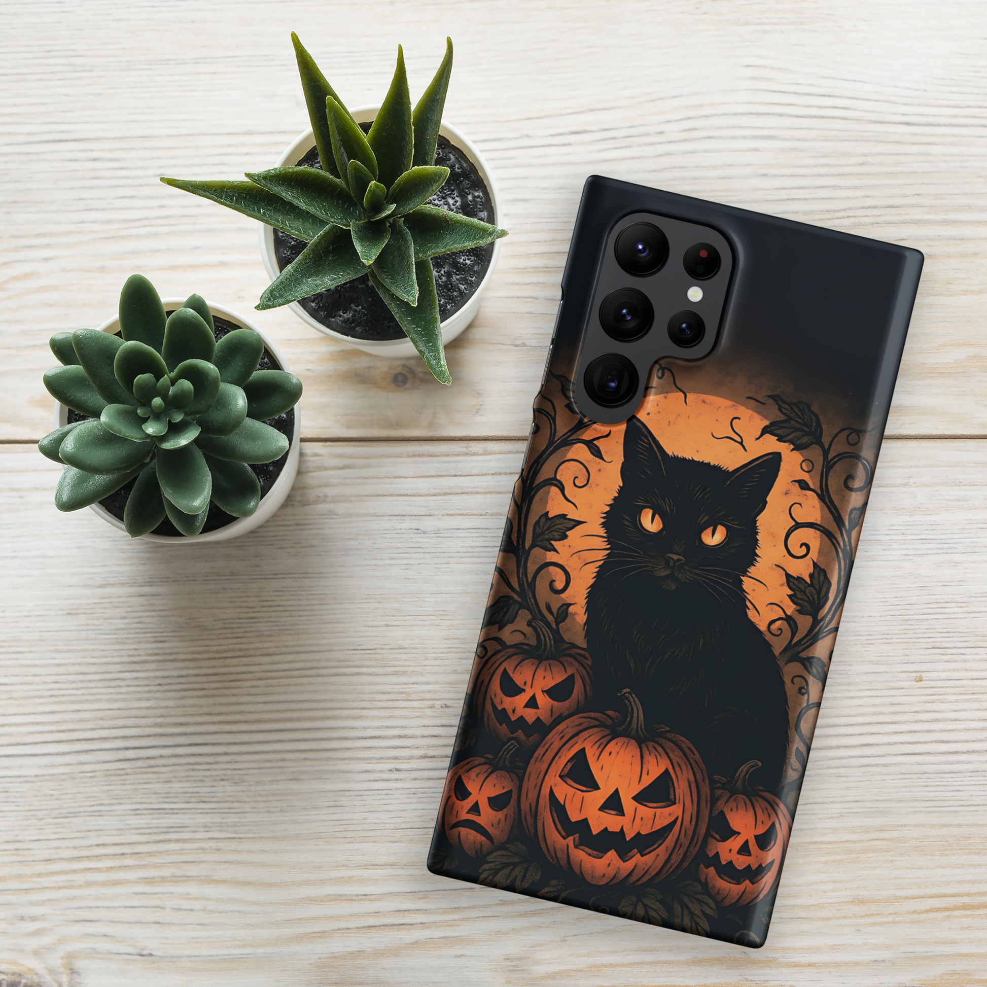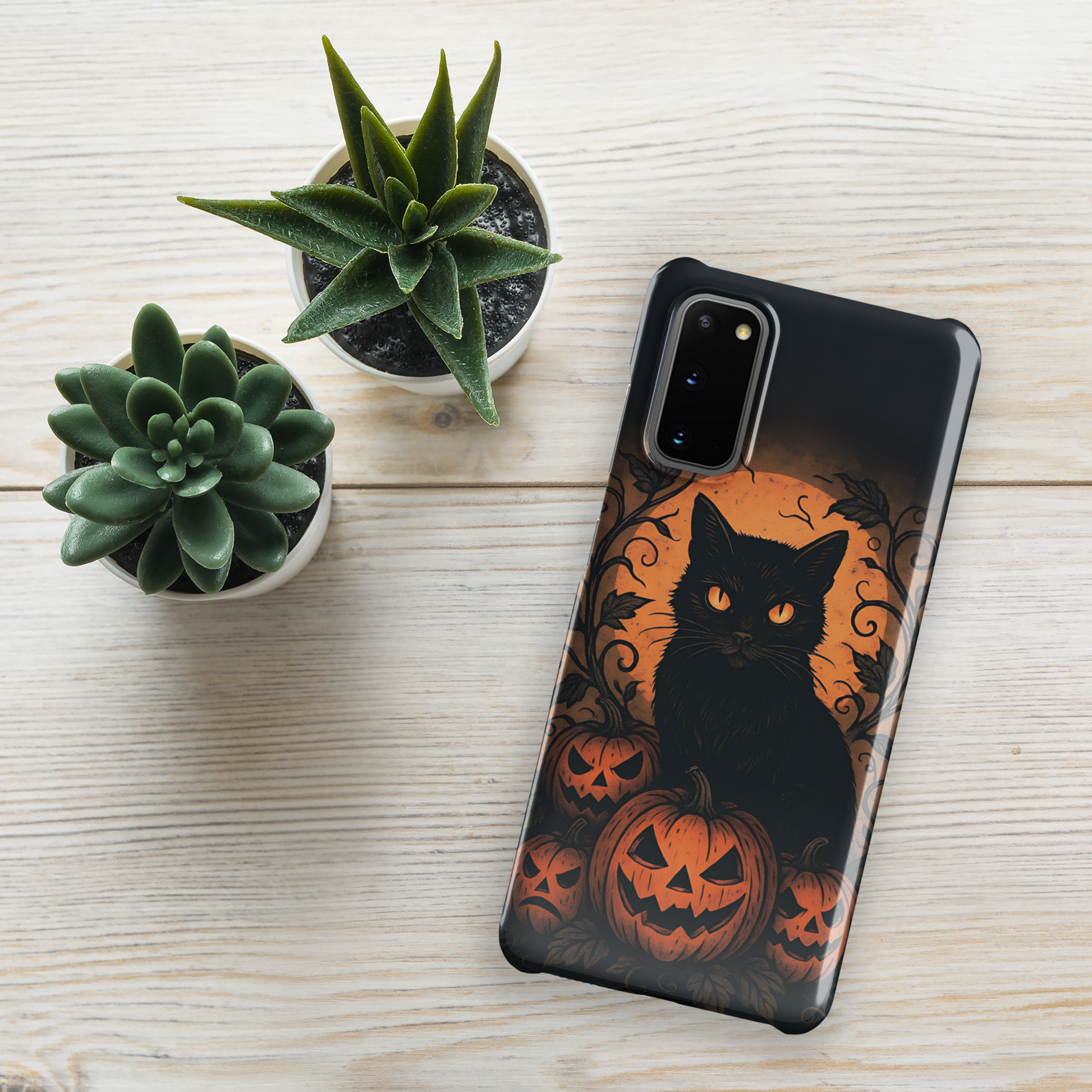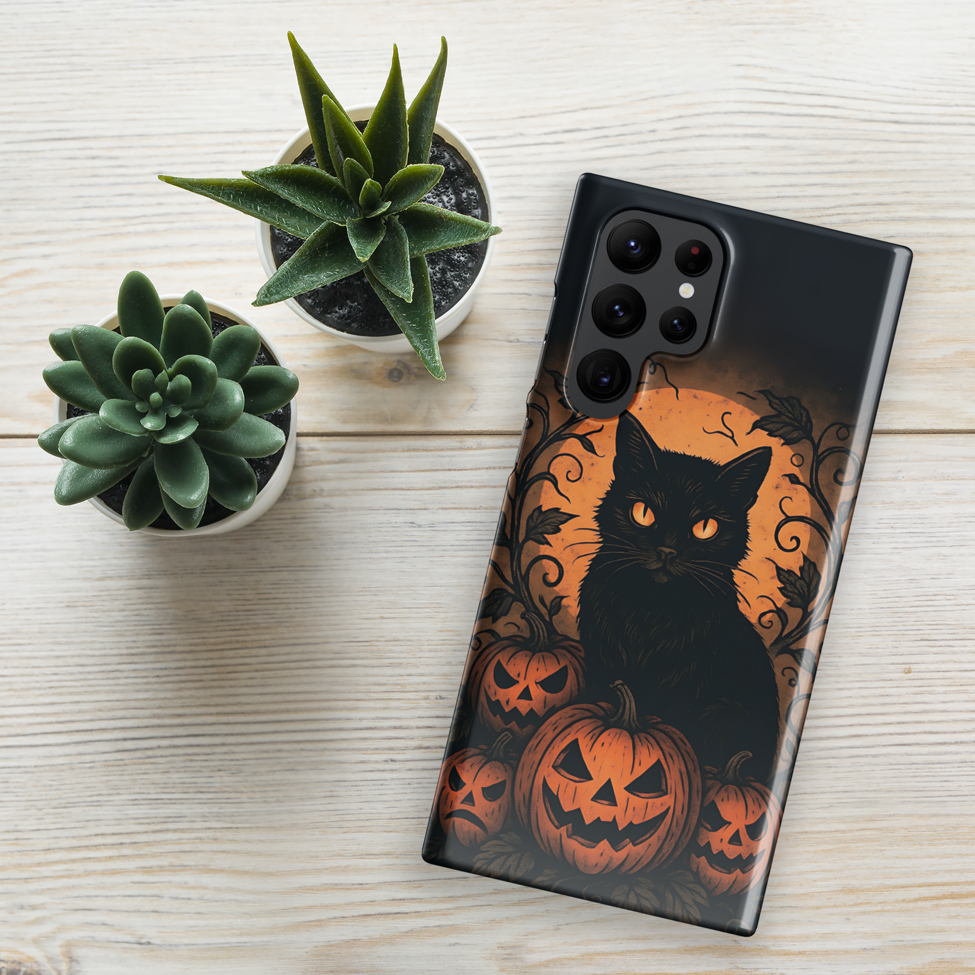Halloween Harvest Cat Samsung Snap Case – Black Cat & Pumpkin Design (Galaxy S10–S25, Plus & Ultra)