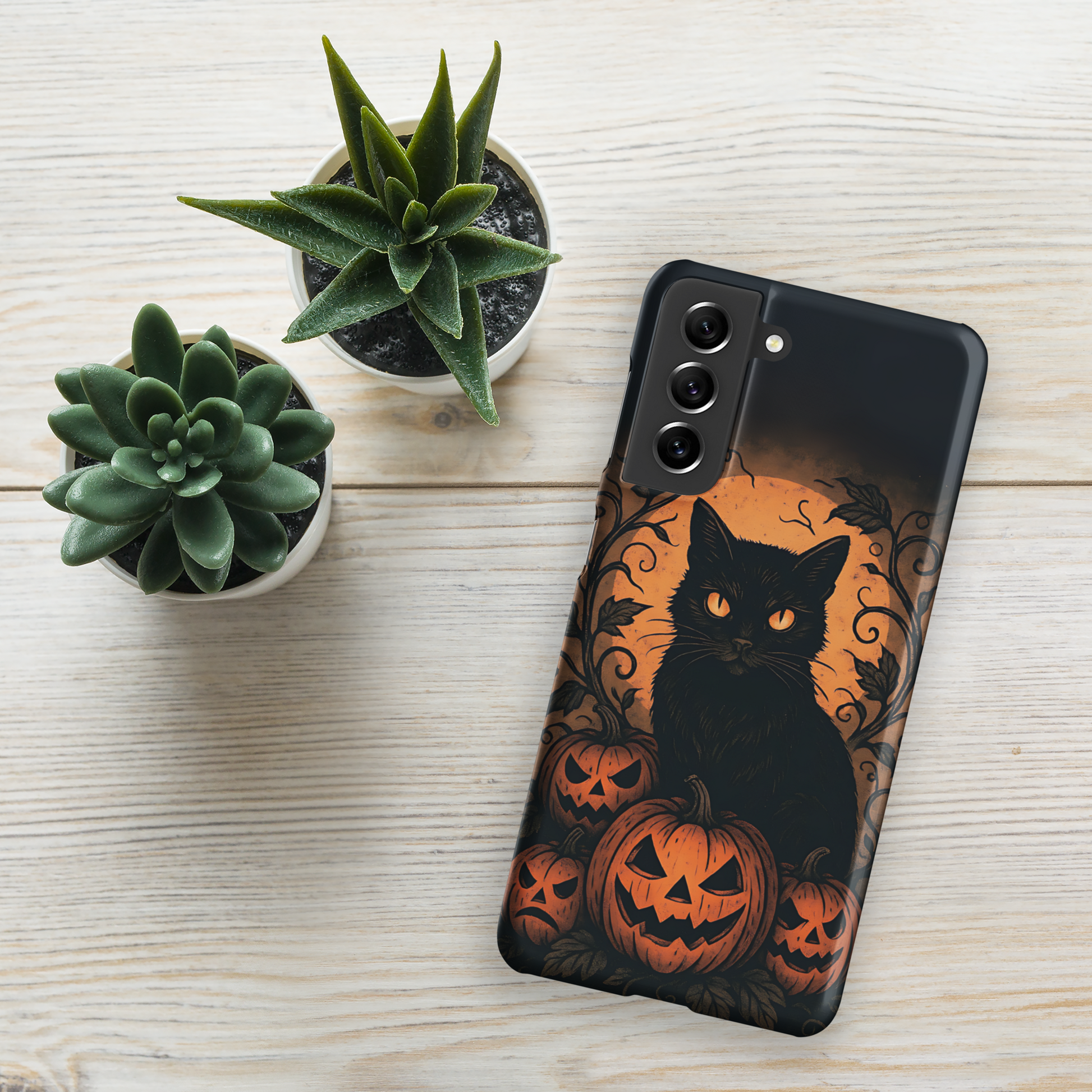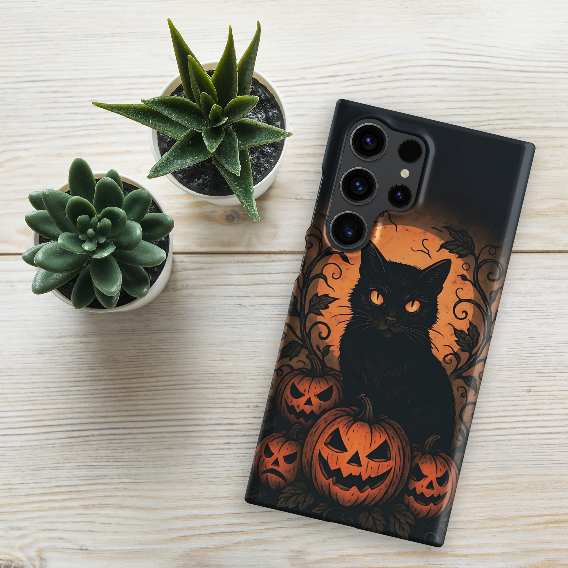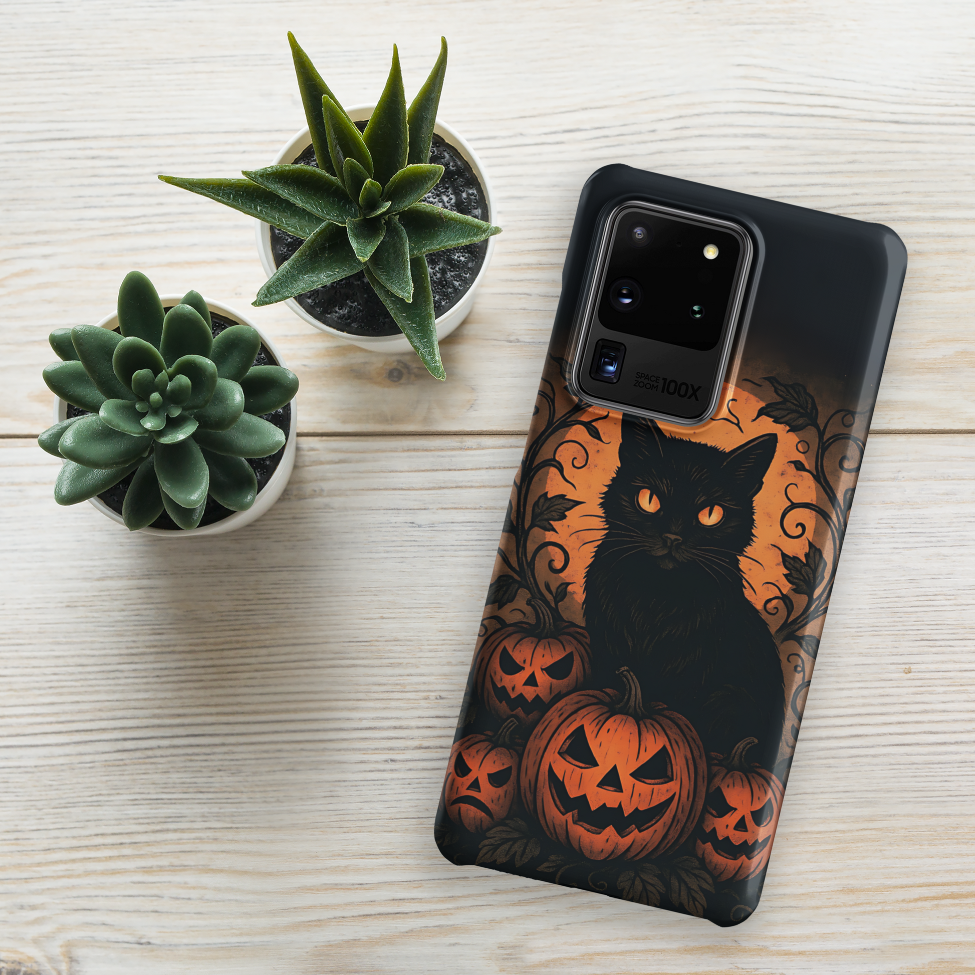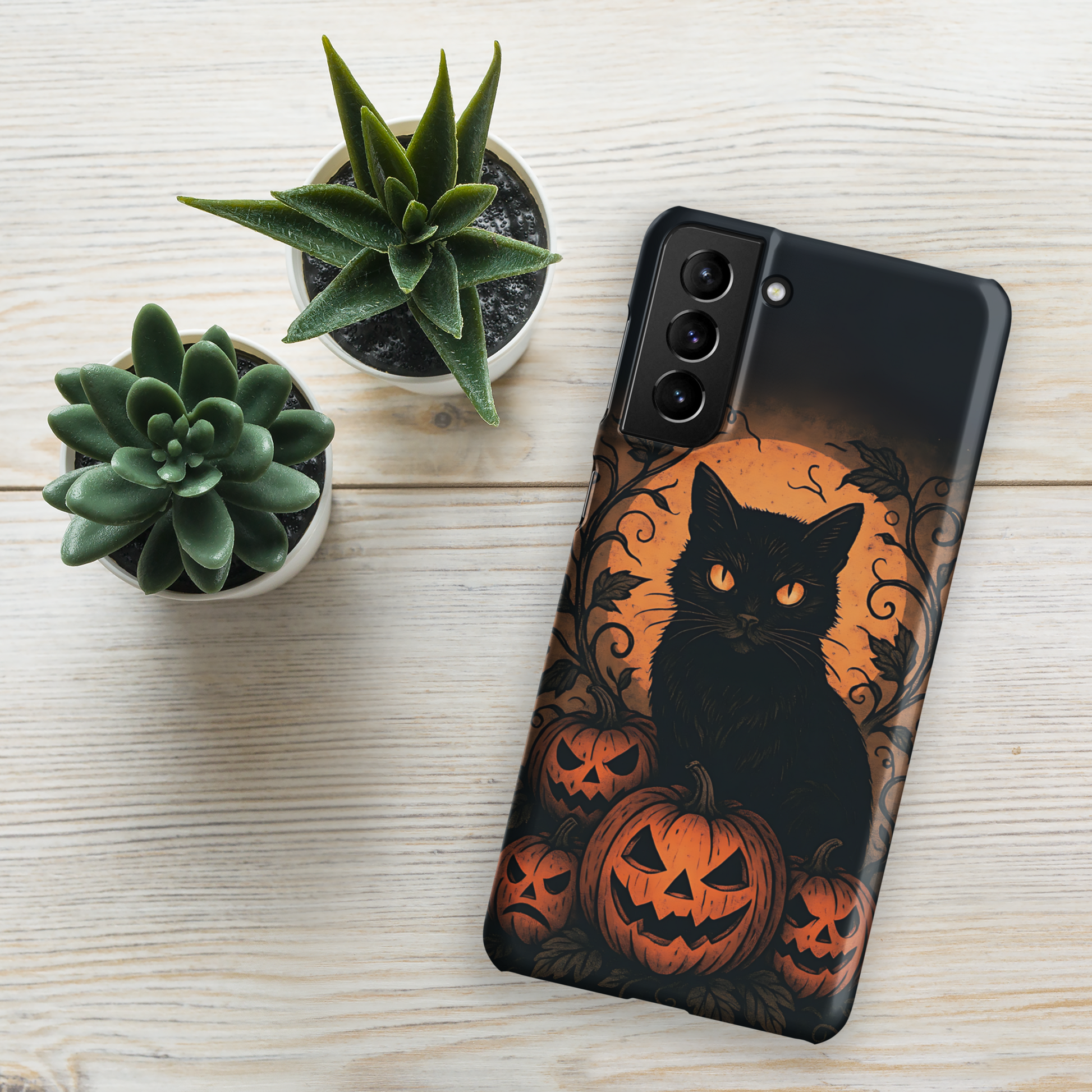 Halloween Harvest Cat Samsung Snap Case – Black Cat & Pumpkin Design (Galaxy S10–S25, Plus & Ultra)