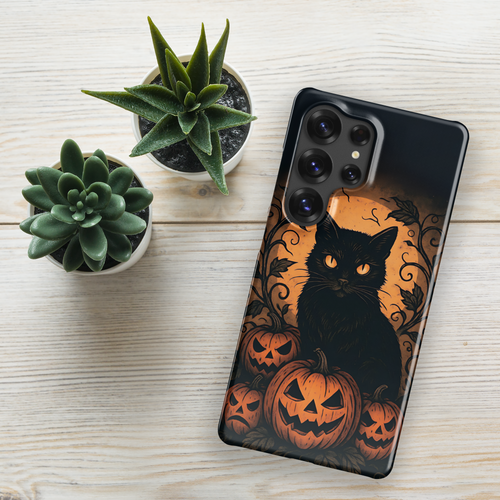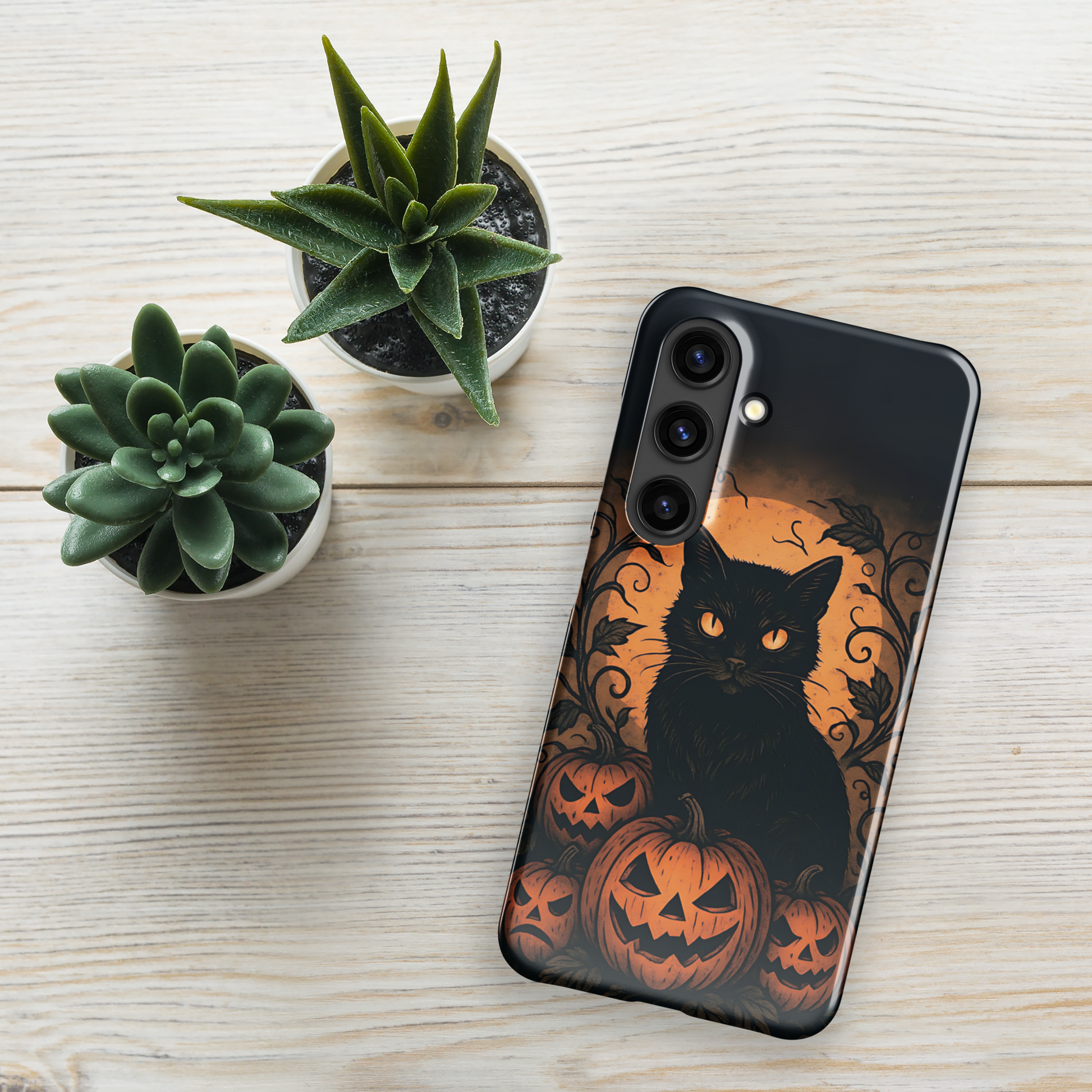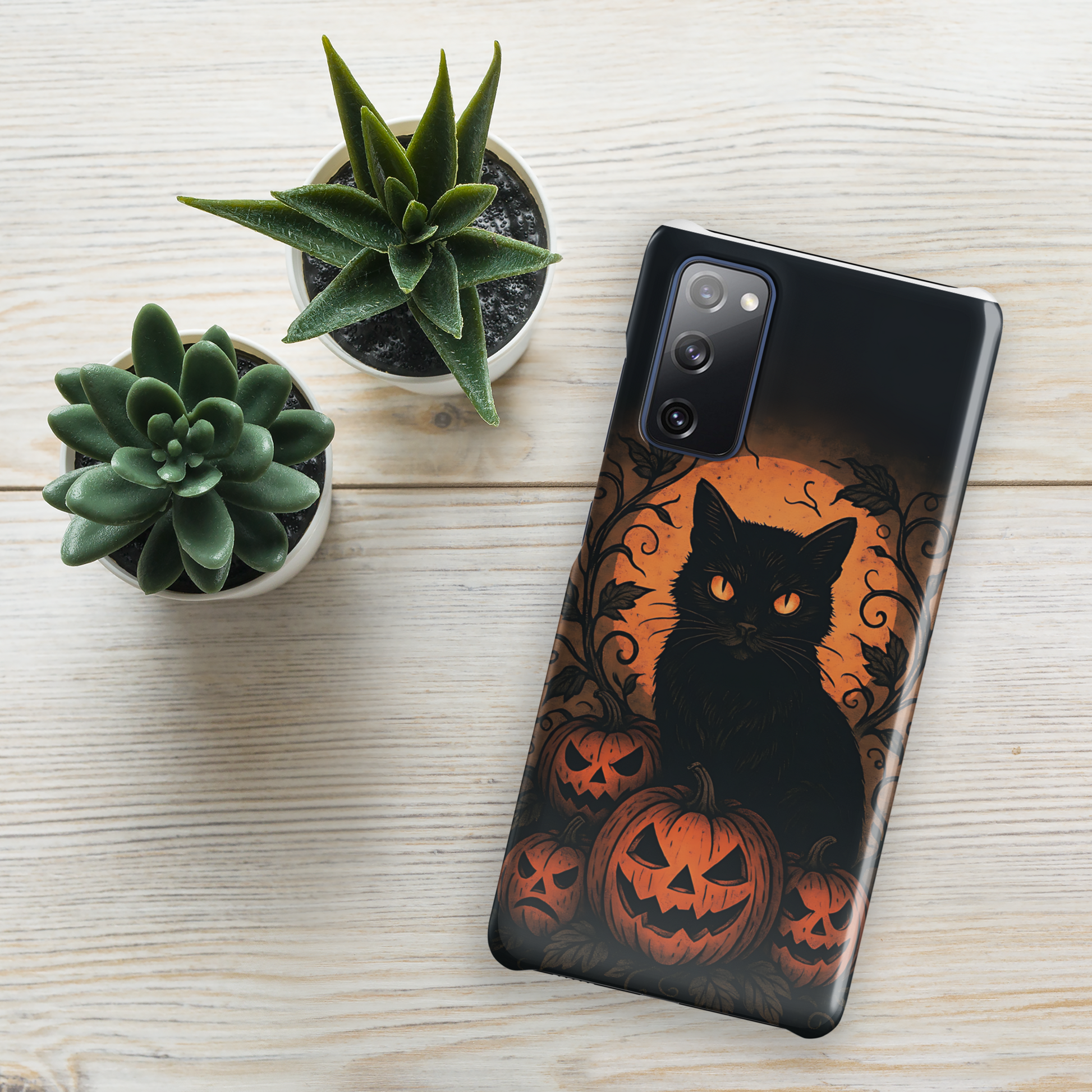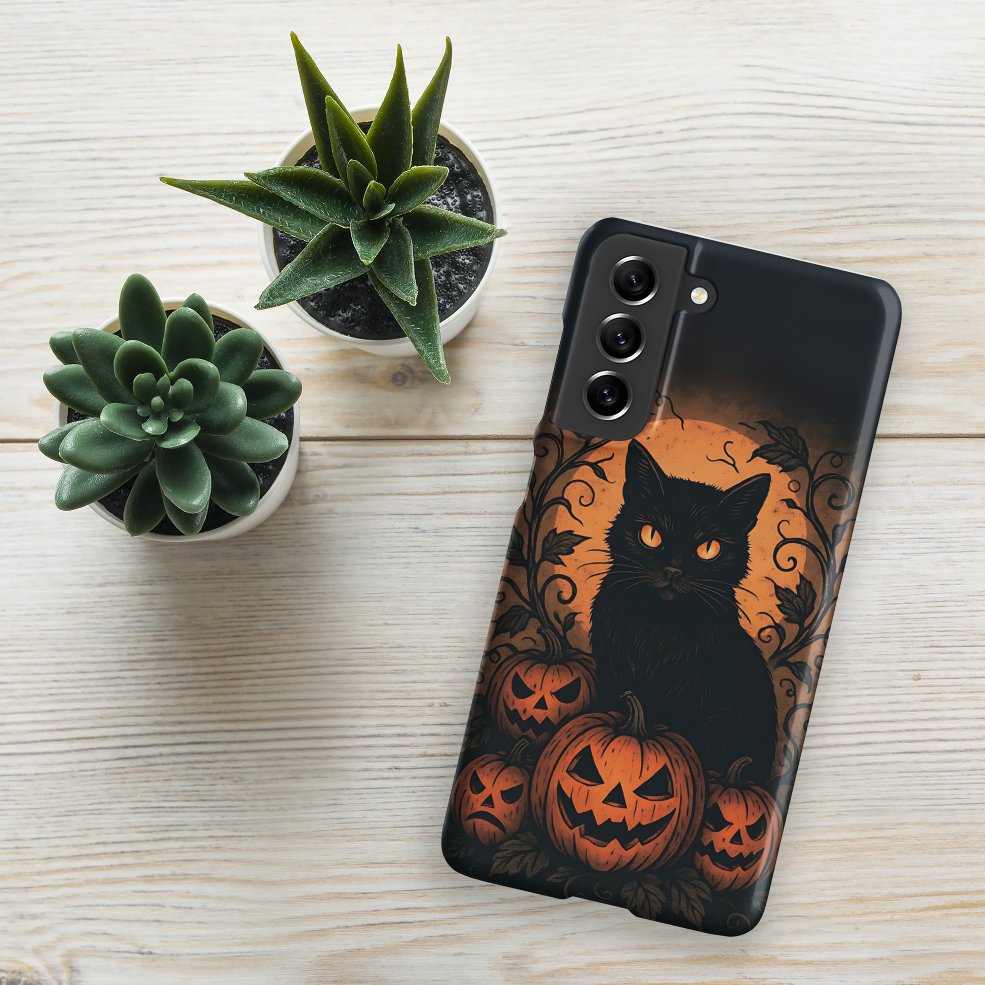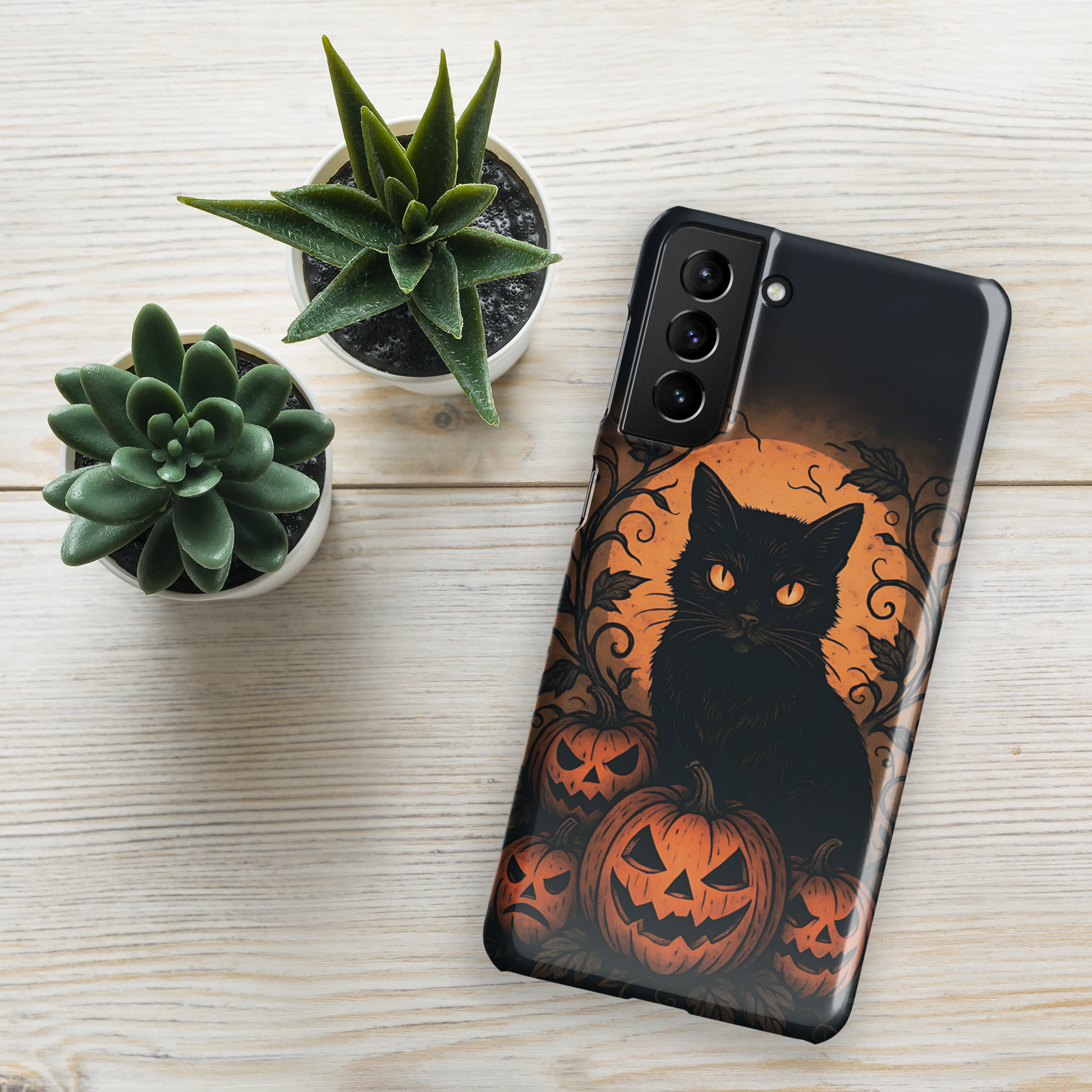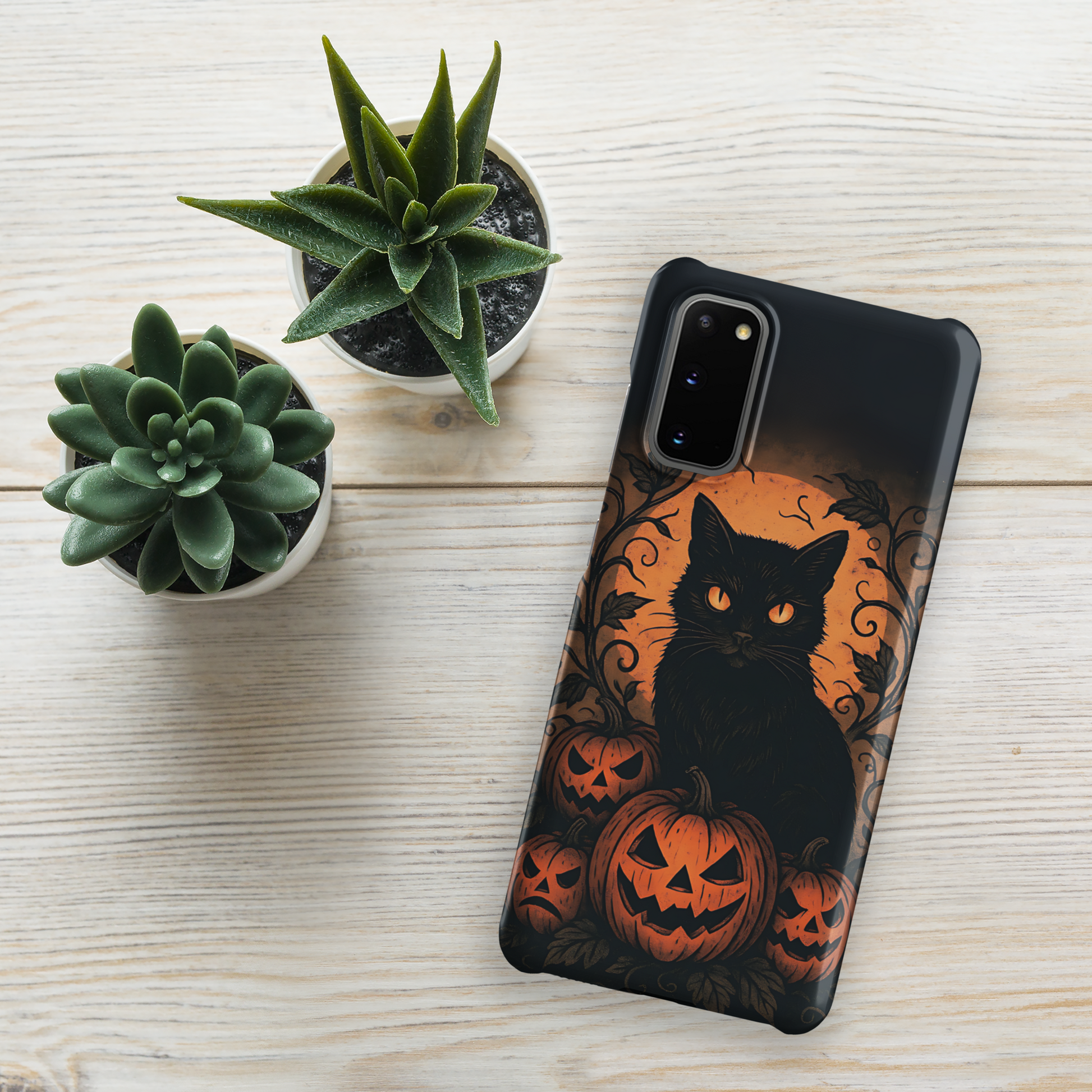 Halloween Harvest Cat Samsung Snap Case – Black Cat & Pumpkin Design (Galaxy S10–S25, Plus & Ultra)