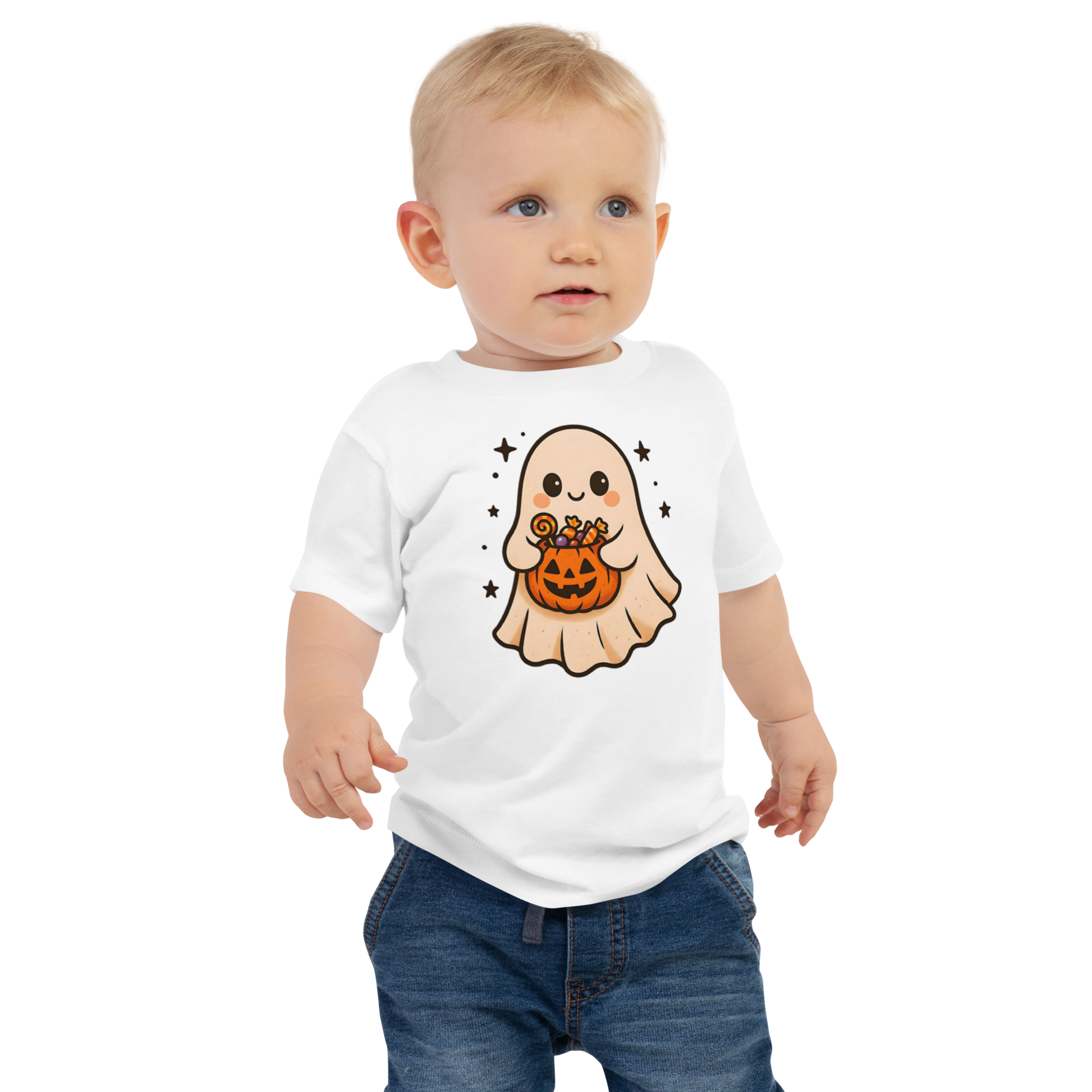 Trick-or-Treating Happy Ghost Baby Tee – Halloween Short Sleeve Shirt (6–24M, Black, Blue, Pink, White)