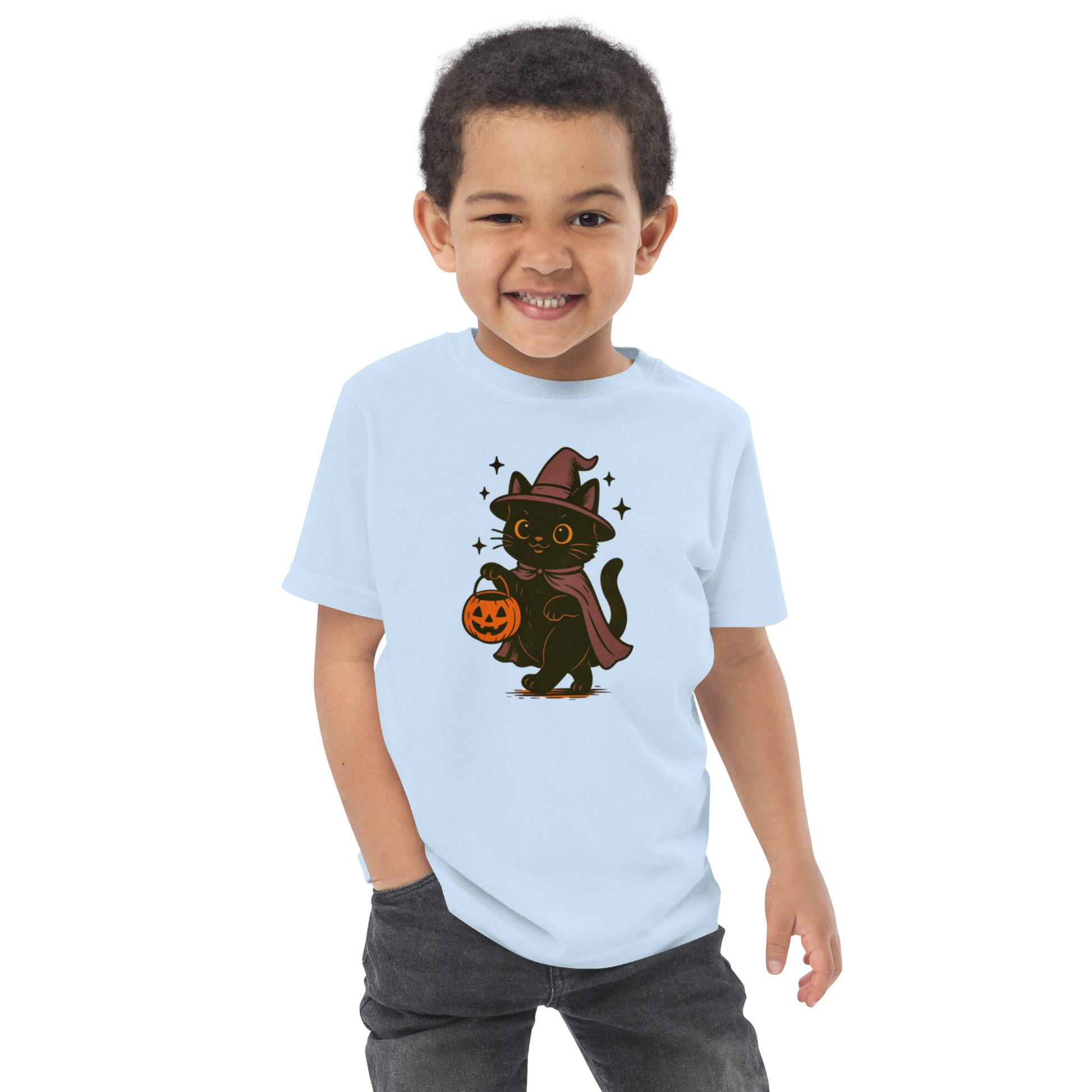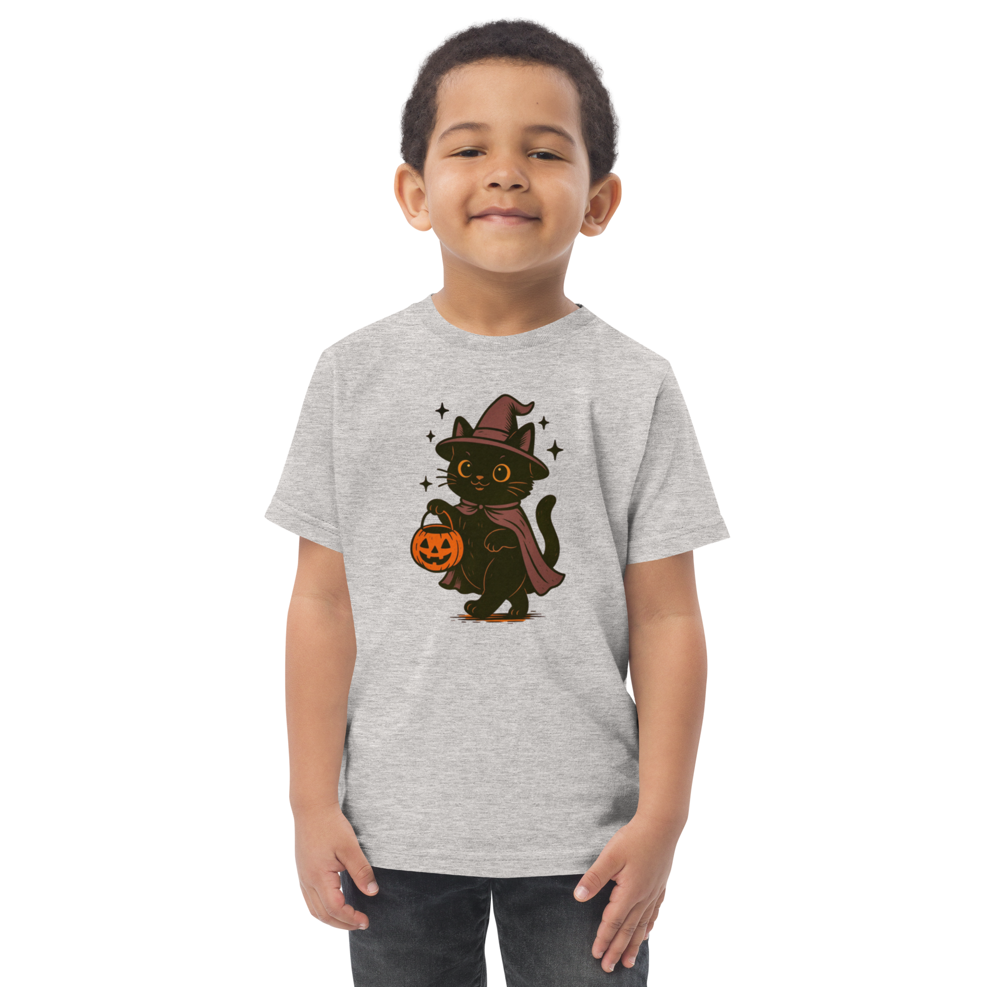 Trick-or-Treating Witch Kitty Toddler T-Shirt – Halloween Cat Tee for Kids (Sizes 2T–6T, Heather, White, Light Blue)